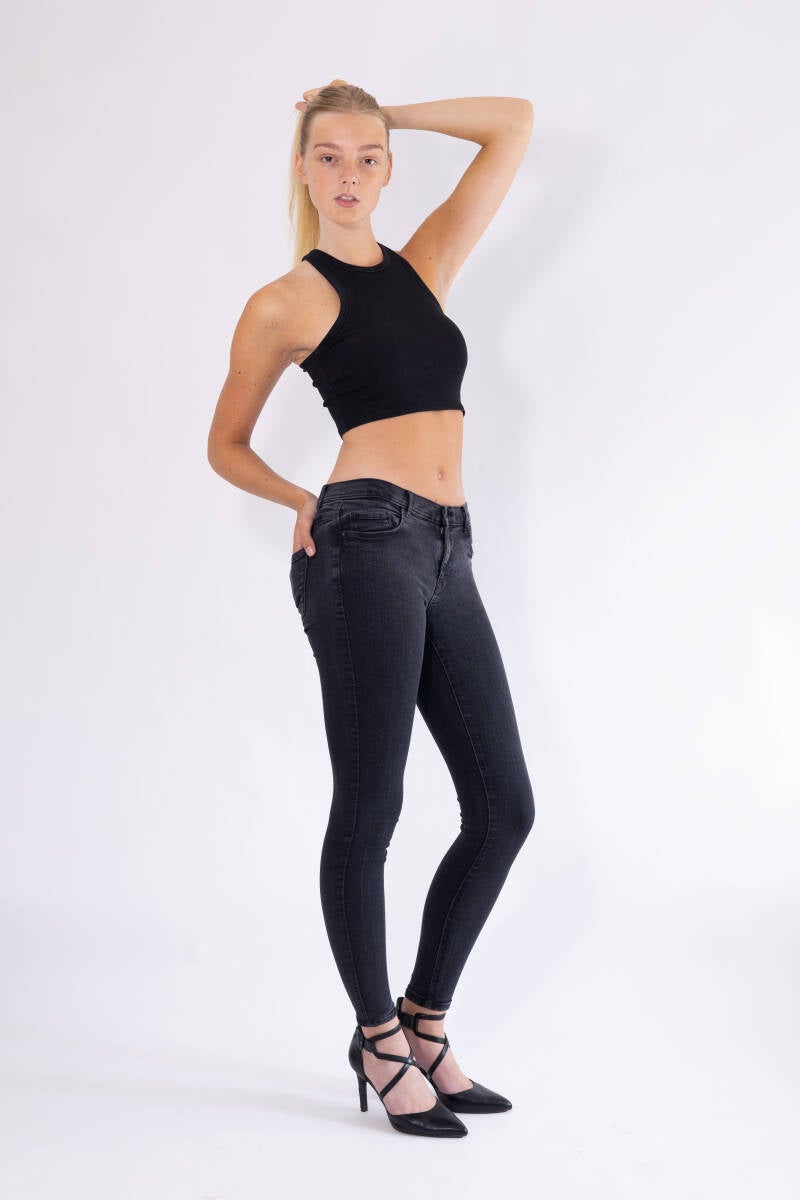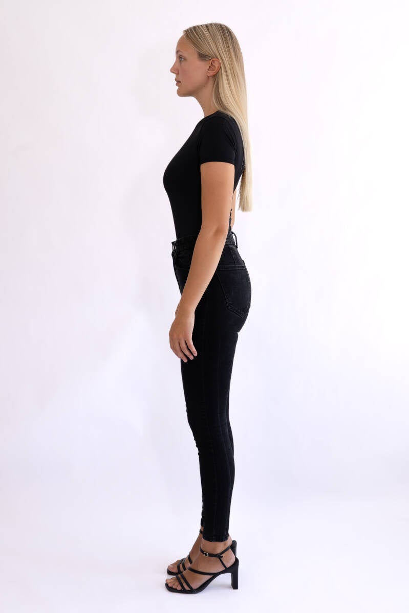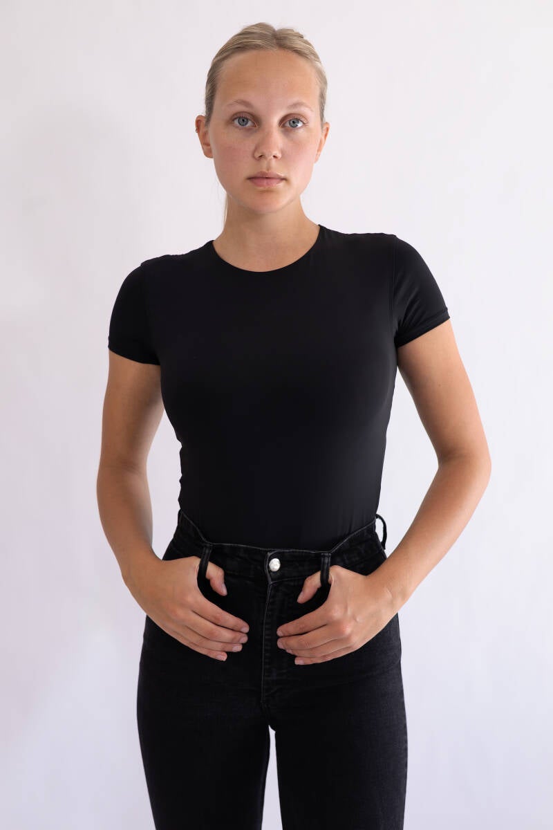 - Schlichte Kleidung: Enge, unifarbene Outfits (z. B. Jeans und ein enges Top) zeigen die Körperproportionen optimal